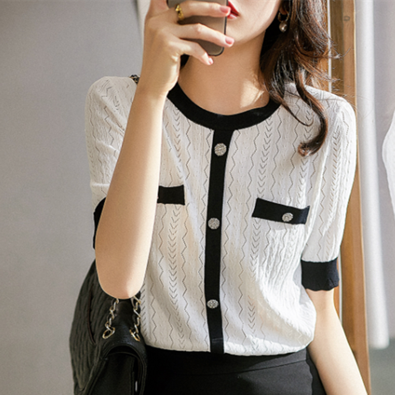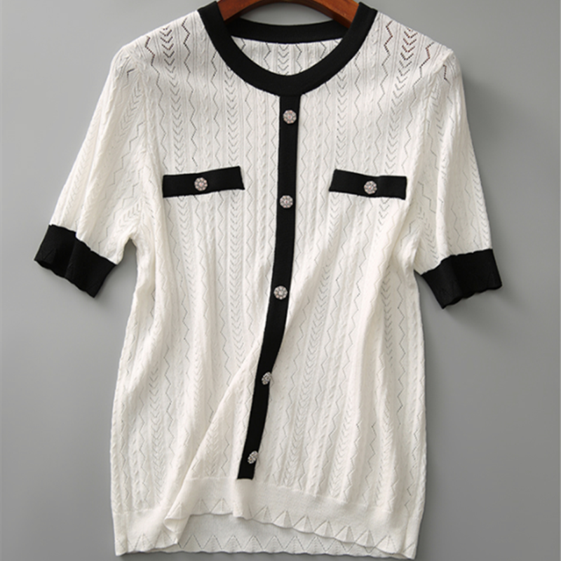 トップス Tシャツ ラウンドネック シンプル 定番 配色 半袖 ニット ホワイト ブラック S M L XL