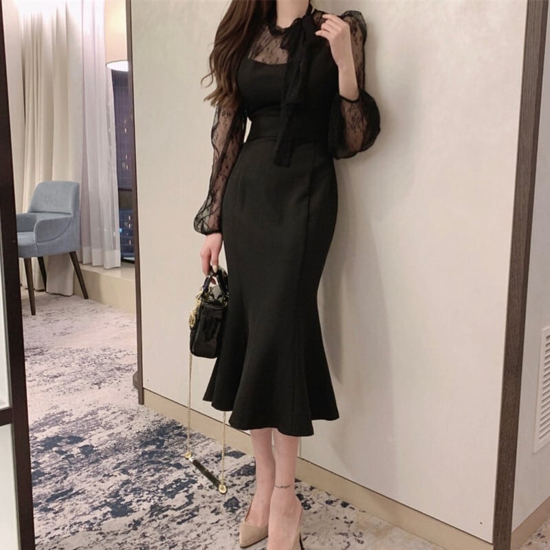 ワンピース レース ロングワンピース 無地 フィッシュテール エレガント アプリコット ブラック S M