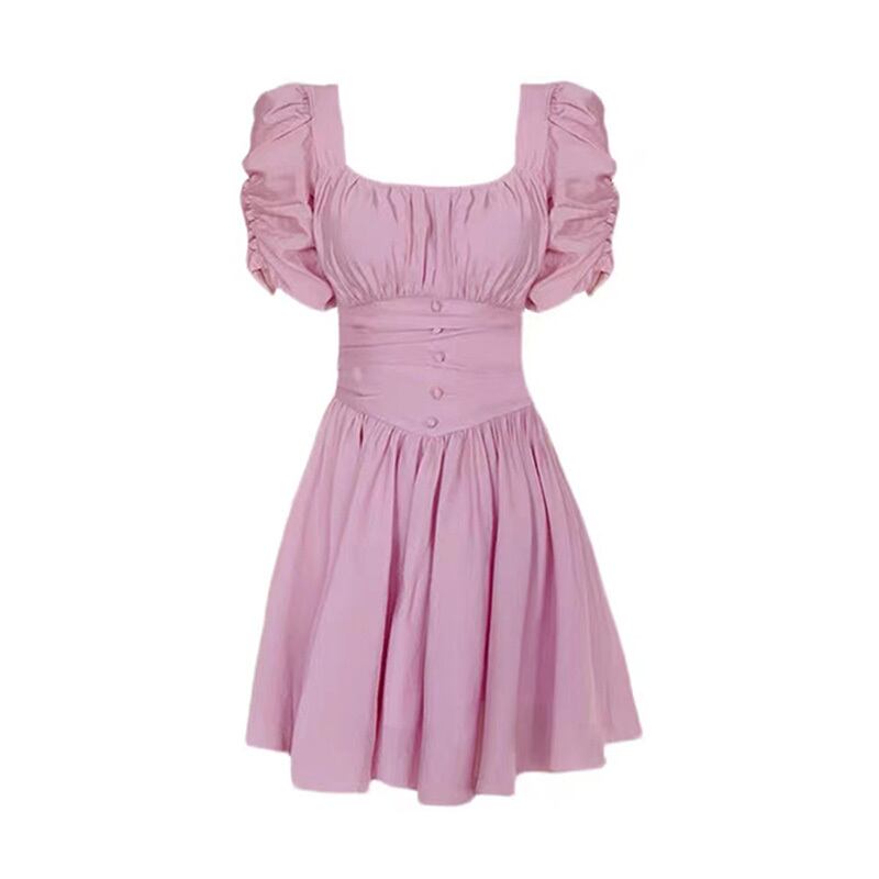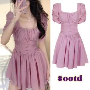 ワンピース 女子力アップ Aライン かわいい スクエアネック 半袖 シボ裾 ピンク XS S M L