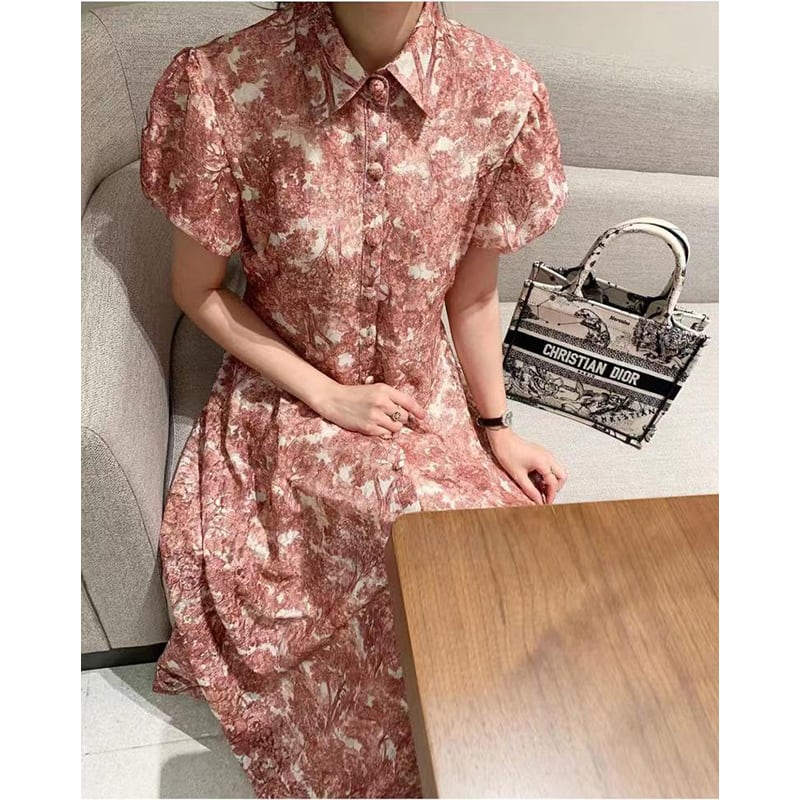 ワンピース シングルブレスト パフスリーブ プリント ロング カジュアル シャツワンピース ブルー ピンク レッド