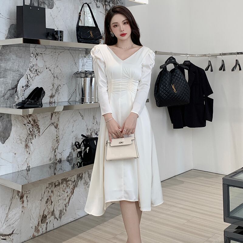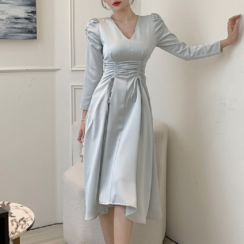 ワンピース 無地 2色 Vネック 長袖 女性らしい ベージュ ライトブルー S M L XL