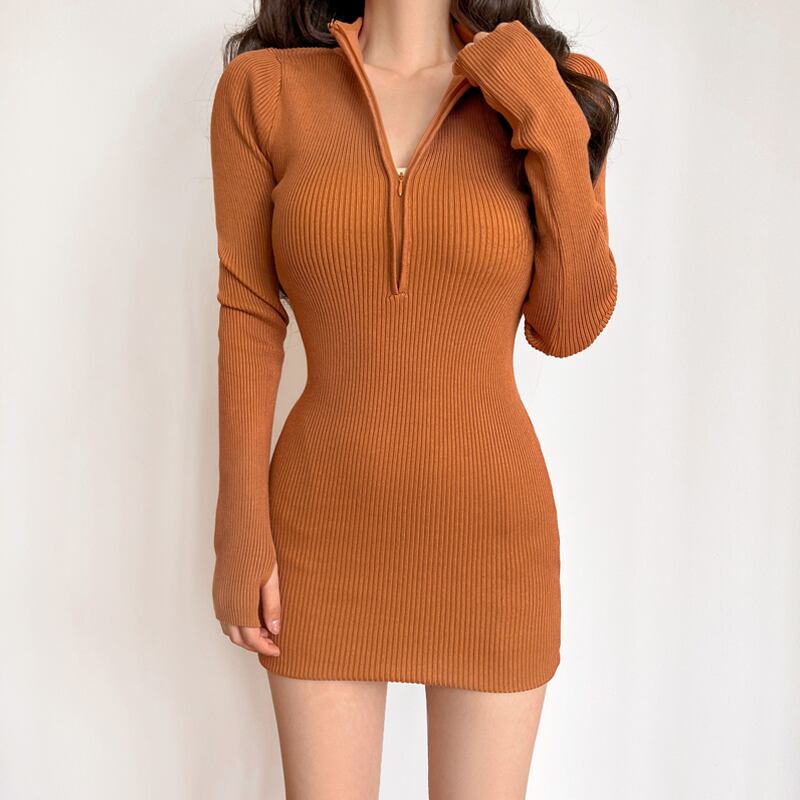 ワンピース 5色展開 ニット スタンドネック 膝上 無地 ブラック グレー ダークブルー ライトブルー ライトコーヒー S M L XL