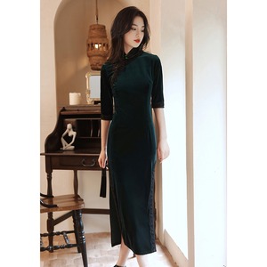 【依妃漫シリーズ】チャイナ風ワンピース 5色展開 ビロード パープル ワインレッド ピンク ブラック ダークグリーン S M L XL 2XL