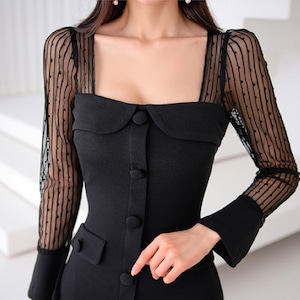 ワンピース スクエアネック 黒 膝上 ドット柄 ブラック S M L XL
