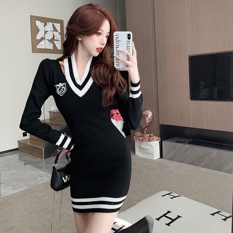 【CHERRYシリーズ】ワンピース ニット 黒 膝上 ストライプ柄 長袖 ブラック S M L