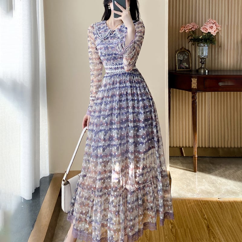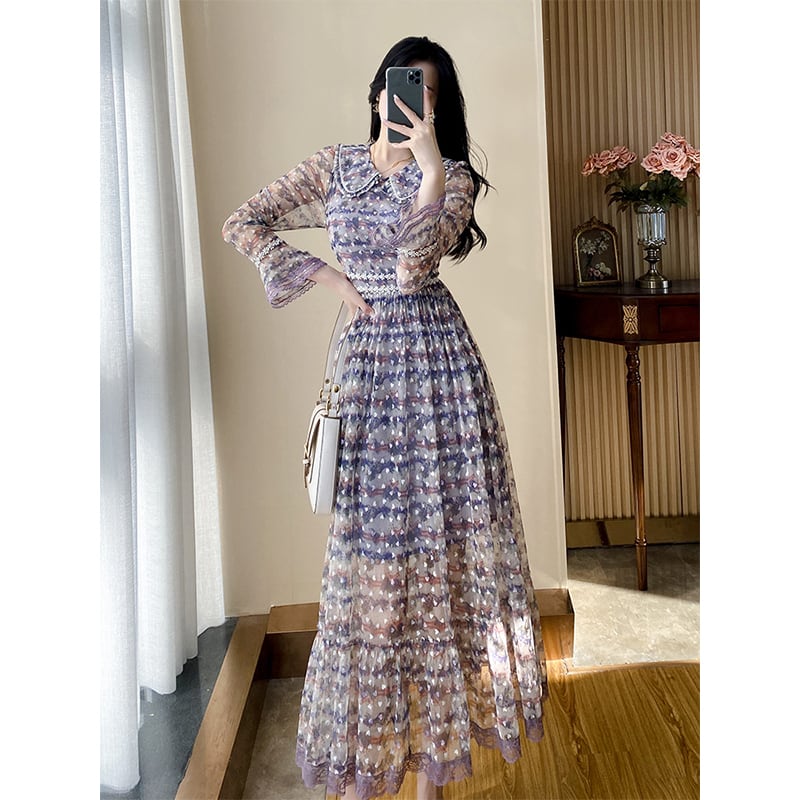 【Aivimoシリーズ】ワンピース 花柄 シフォン エレガント シボ裾 Aライン パープル 大きいサイズ S M L XL