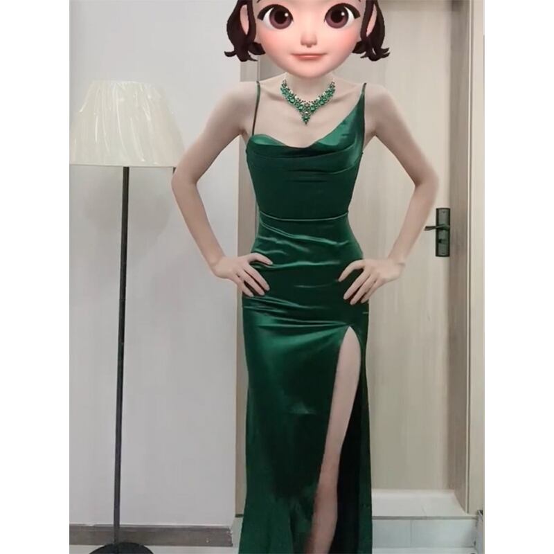 ワンピース セクシー パーティー ロング丈 シルク 吊りワンピース グリーン S M L XL