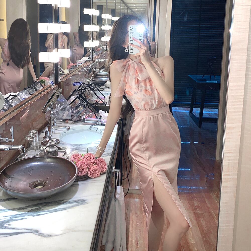 【CHERRYシリーズ】ワンピース ノースリーブ プリント セクシー 女性らしい ピンク S M L
