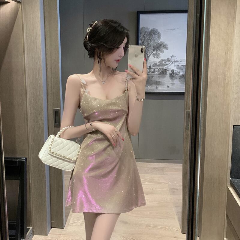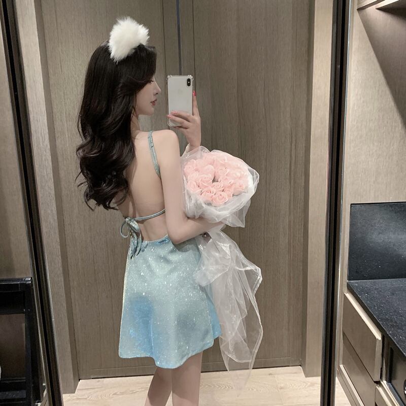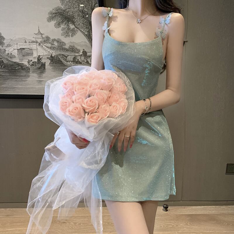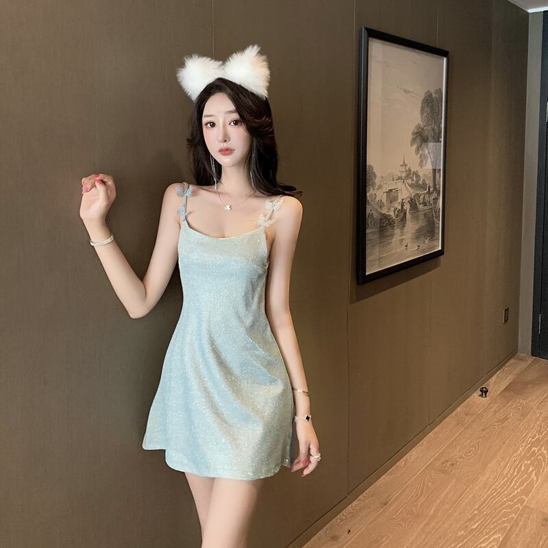 ワンピース スウィート バタフライ キラキラ Aライン 吊りワンピース ブルー ピンク S M L