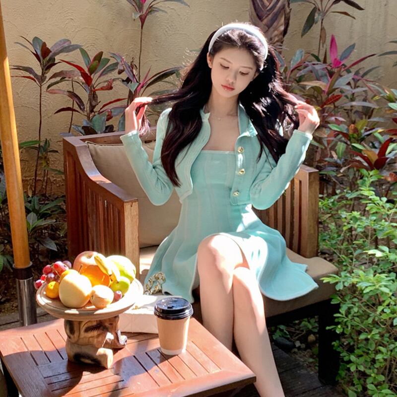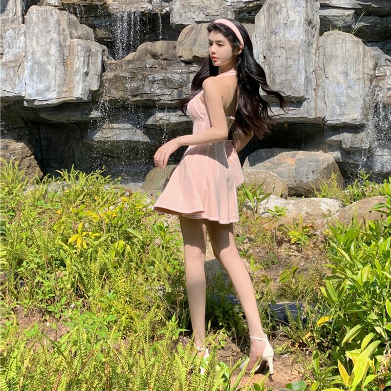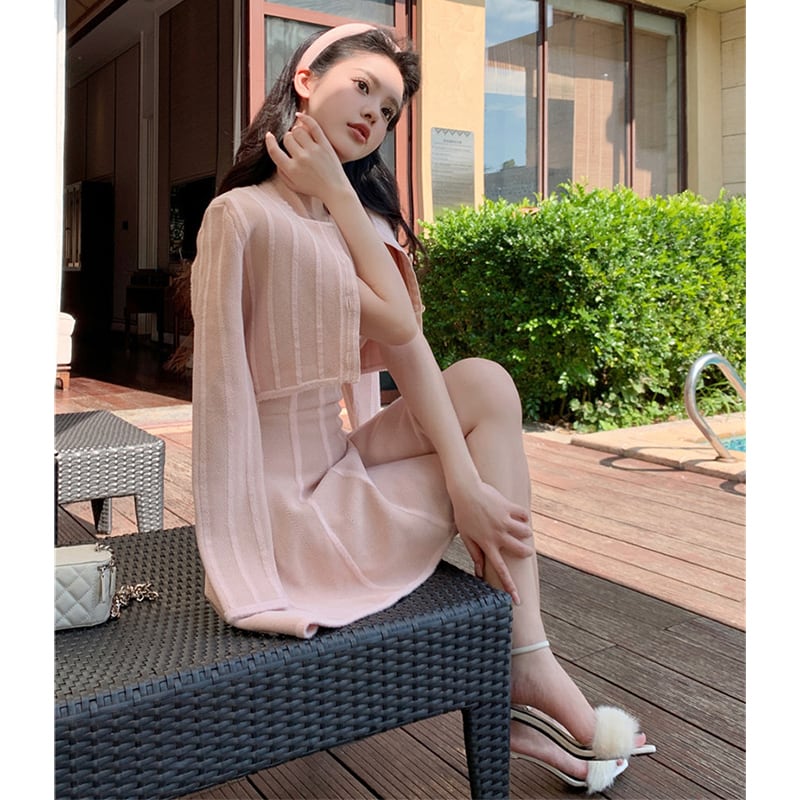 セットアップ セクシー ニット ホルターネック Aライン カーディガン+ワンピース ブルー ピンク