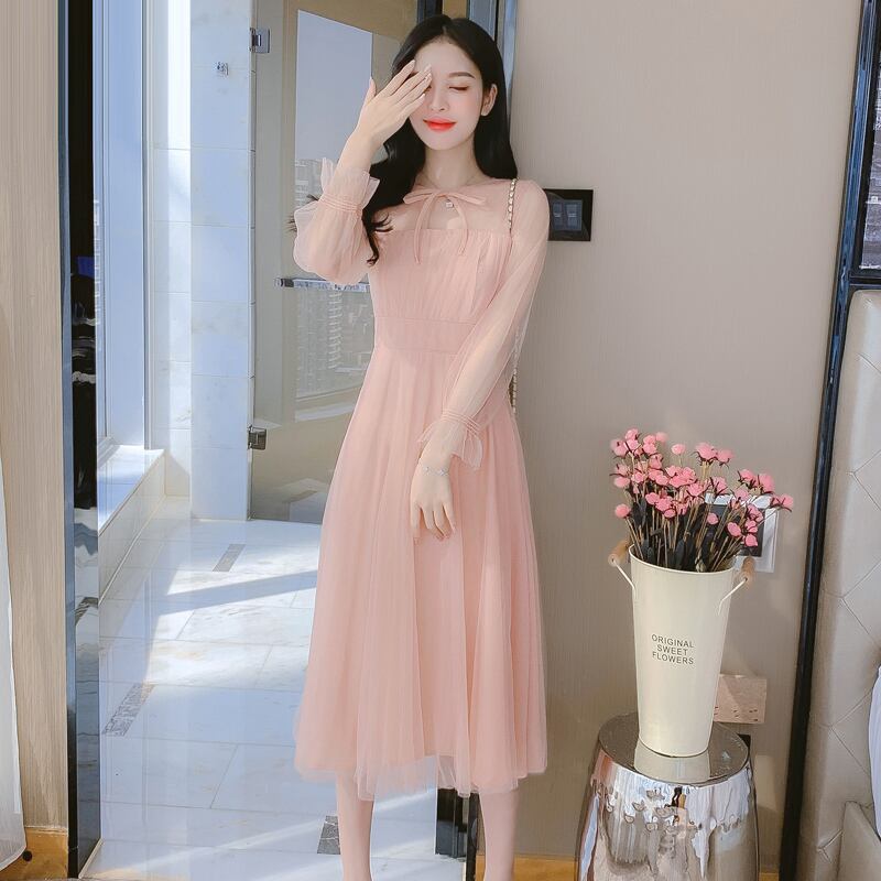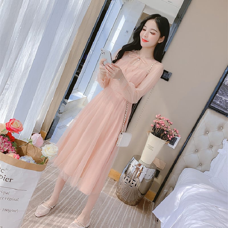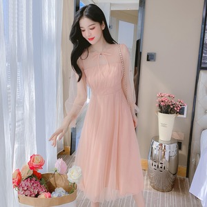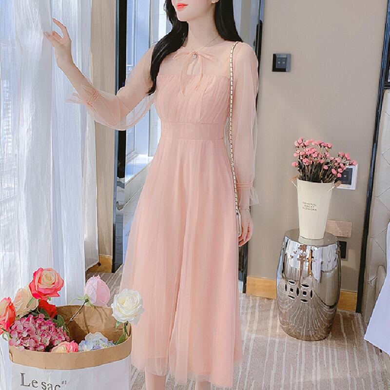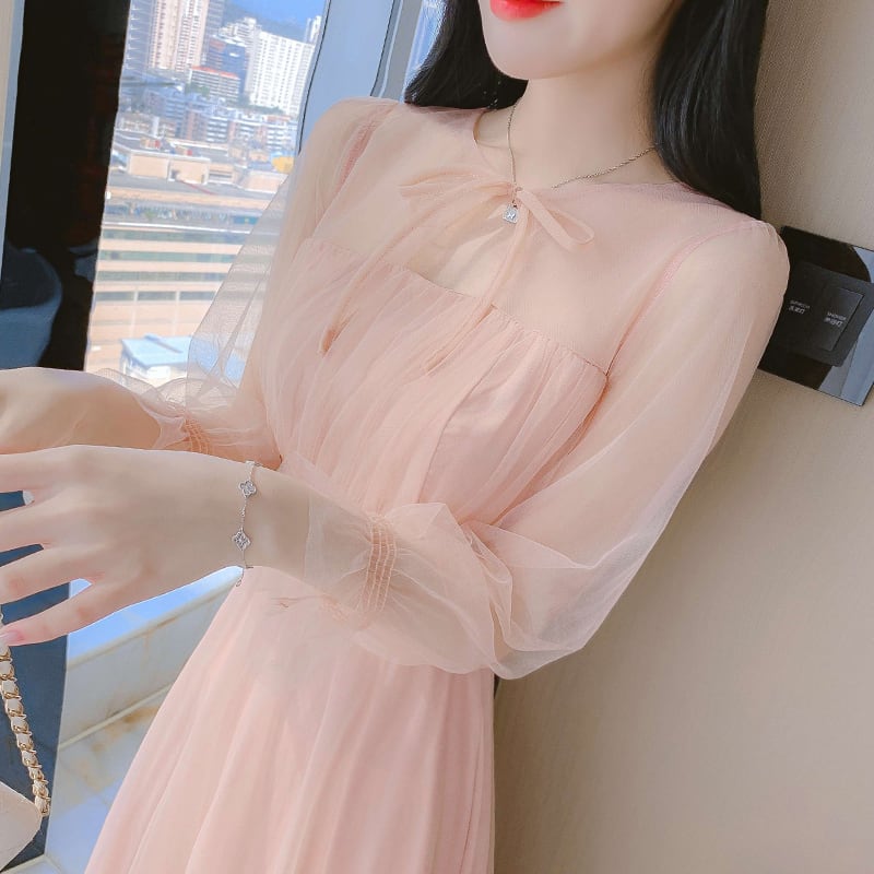 【茵妮シリーズ】ワンピース エレガント パフスリーブ ロング丈 ピンク S M L XL