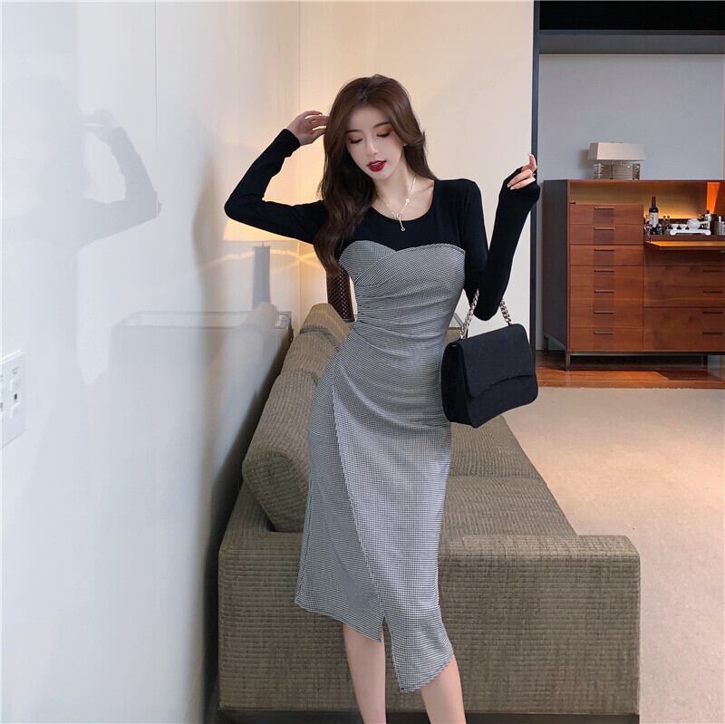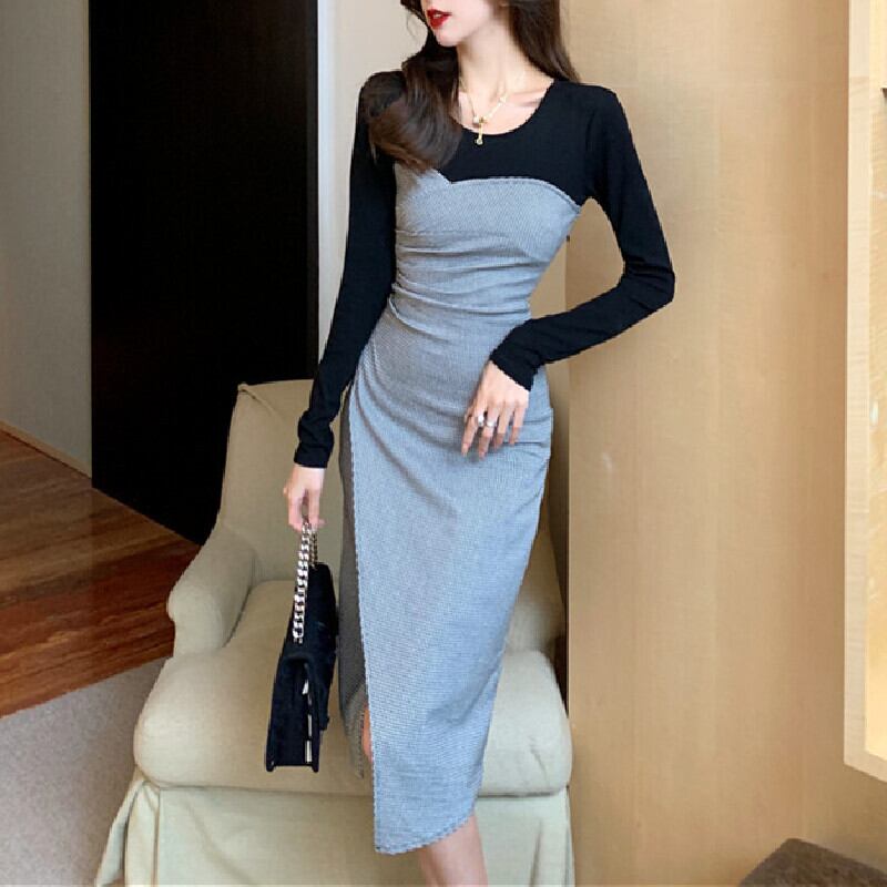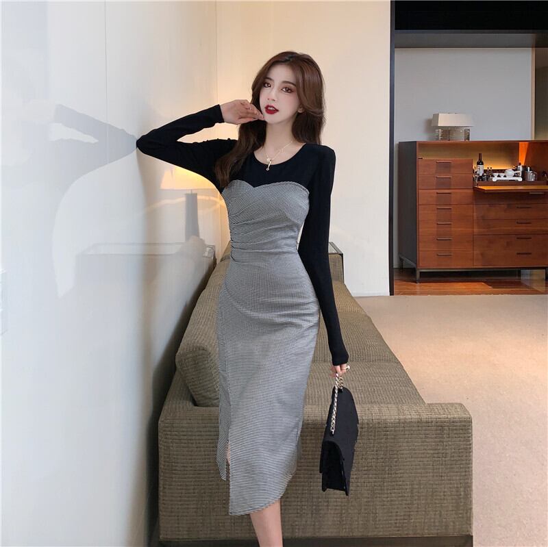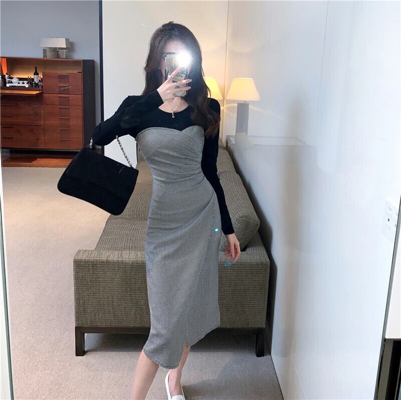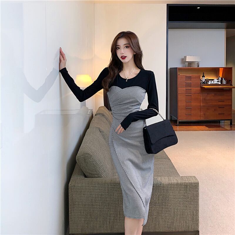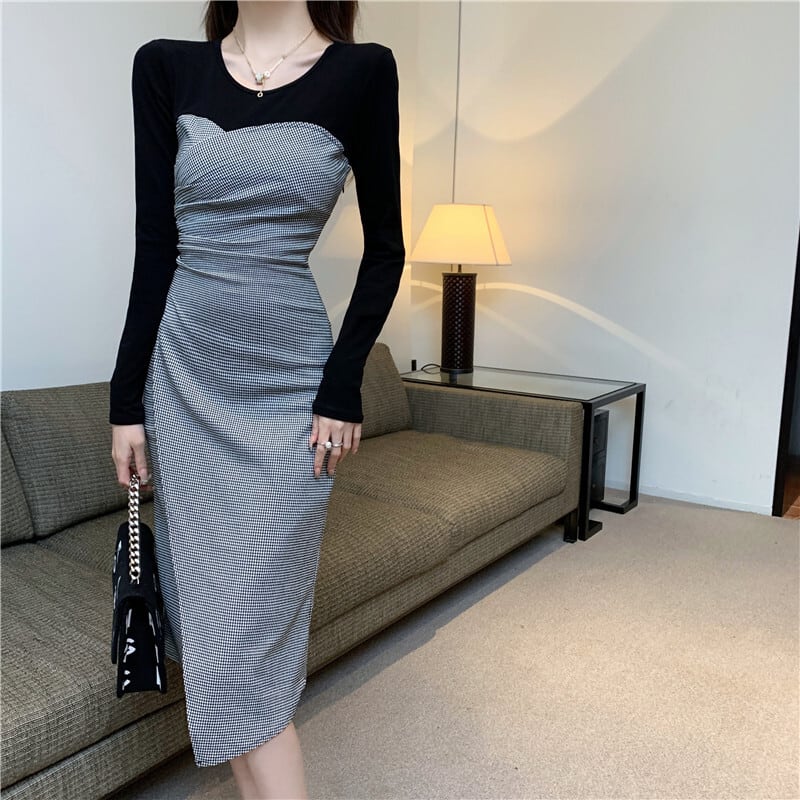 【CHERRYシリーズ】ワンピース ラウンドネック 切り替え チェック柄 S M L