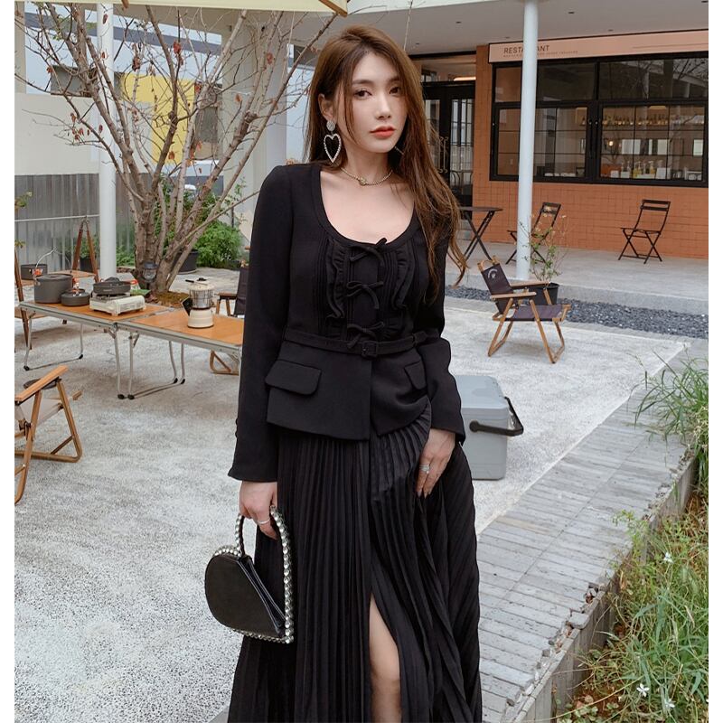 【Airi Styleシリーズ】ワンピース 着心地良い OL/通勤 気質UP フェイクレイヤード シボ裾 切り替え ブラック S M L XL