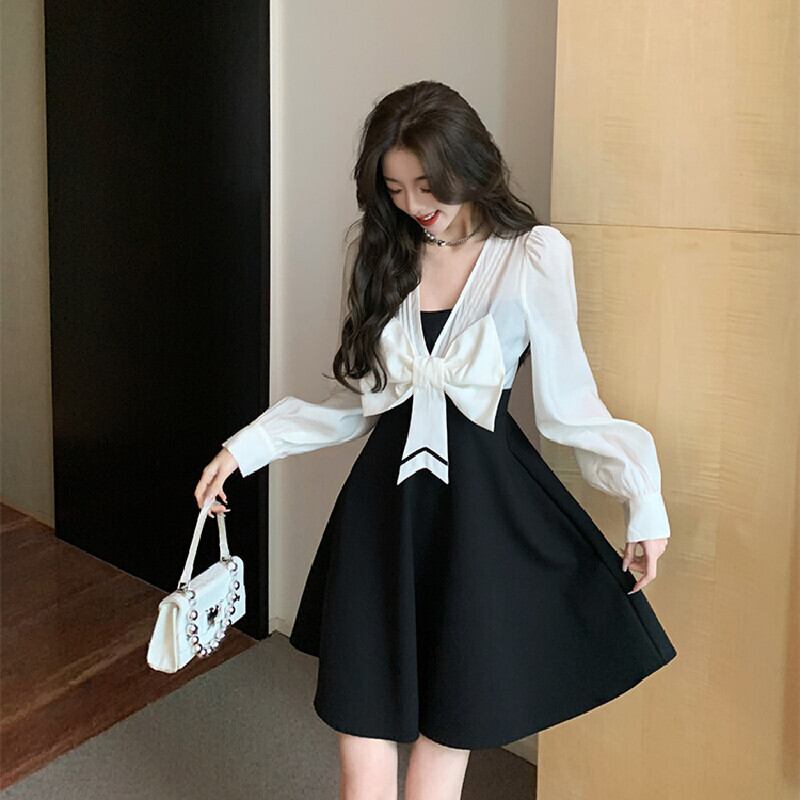ワンピース 蝶結び Aライン 長袖 フェイクレイヤード スウィート S M L XL