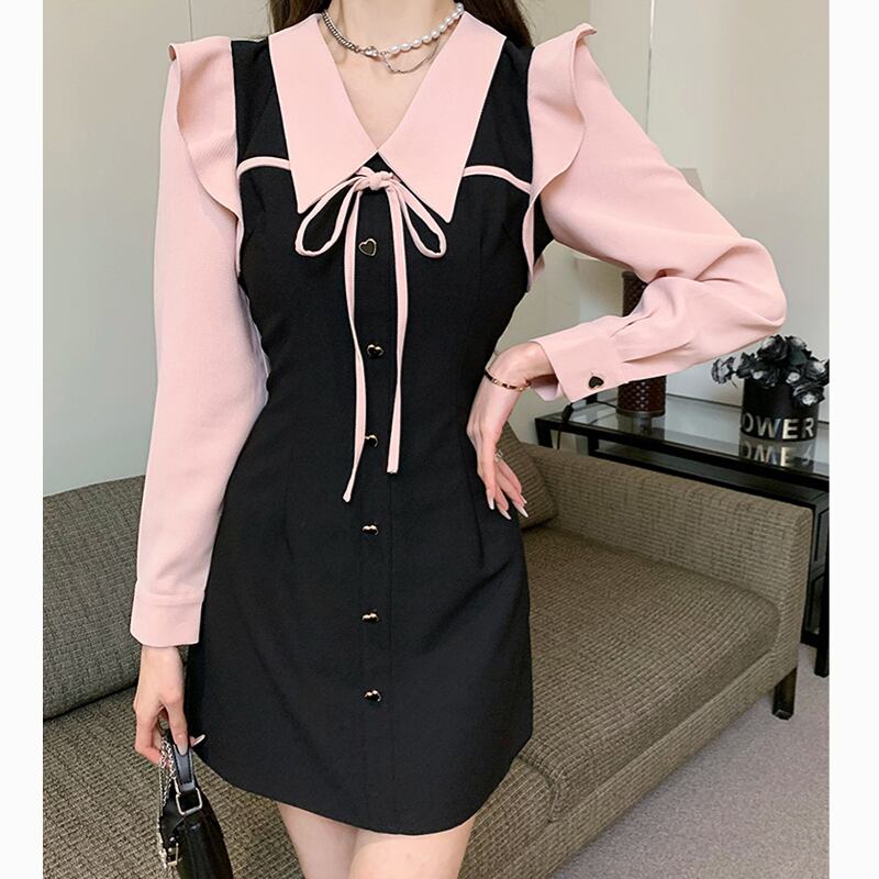 ワンピース シングルブレスト スウィート 配色 ペプラム ブラック+ピンク S M L XL