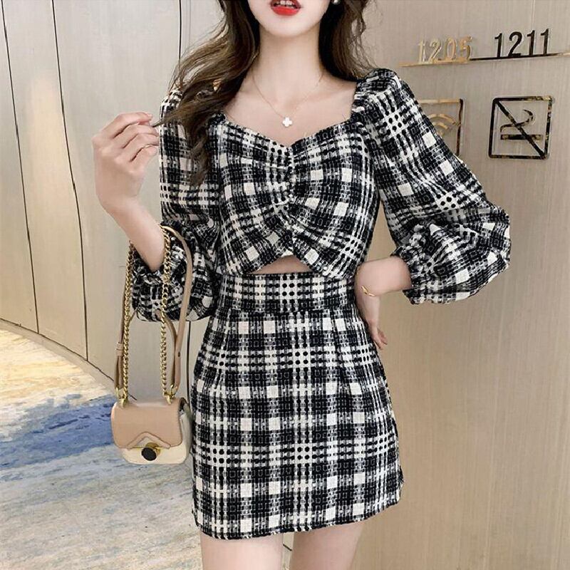 セットアップ トップス+スカート ボートネックデザイン チェック柄 ブラック S M L