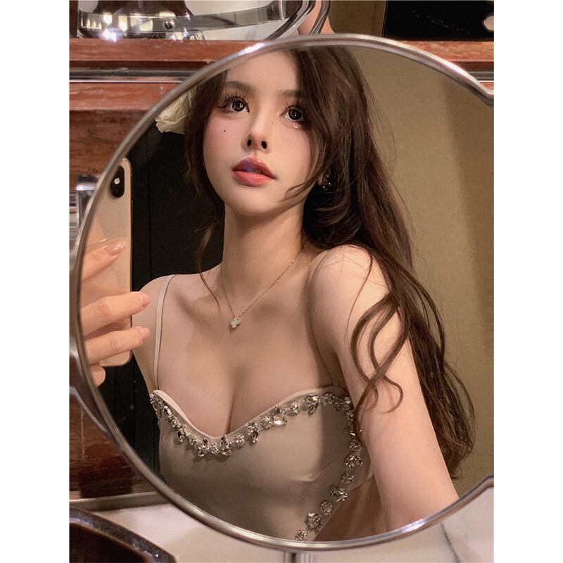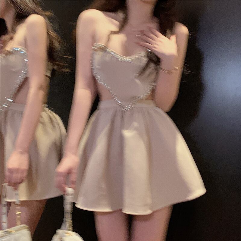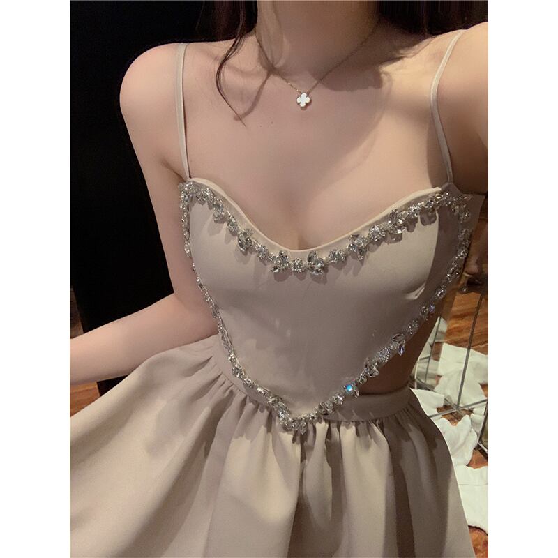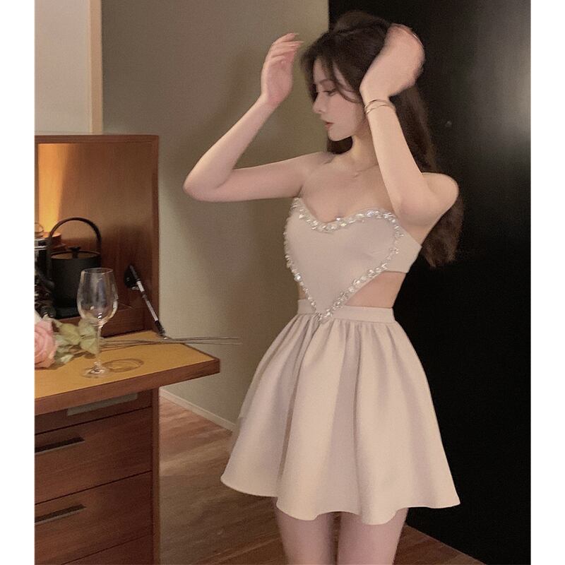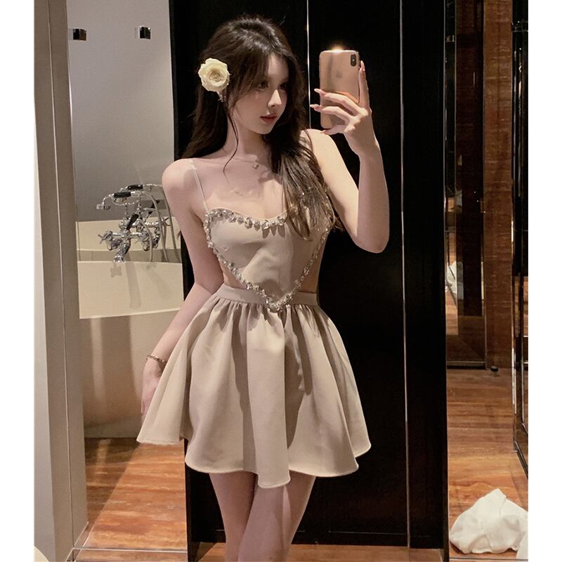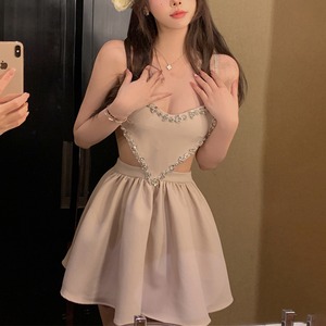 ワンピース セクシー パーティー デザイン感 ラインストーン 吊りワンピース ベージュ S M L