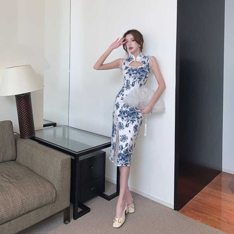 【CHERRYシリーズ】チャイナ風ワンピース レース プリント セクシー 花模様 S M L