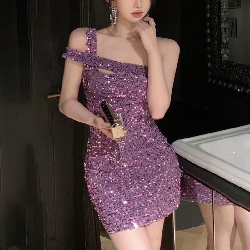 ワンピース おしゃれ セレブリティ スパンコール一 ワンショルダー パーティー パープル S M L