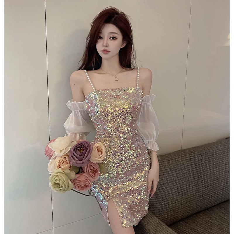 ワンピース フランス風 キラキラ スパンコール一 パーティー 切り替え S M L