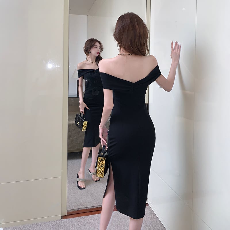 【CHERRYシリーズ】ワンピース 2色展開 無地 ボートネックデザイン パーティー ブラック レッド S M L