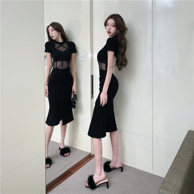 【CHERRYシリーズ】ワンピース セクシー デザイン感 ロング丈 黒 無地 ブラック S M L