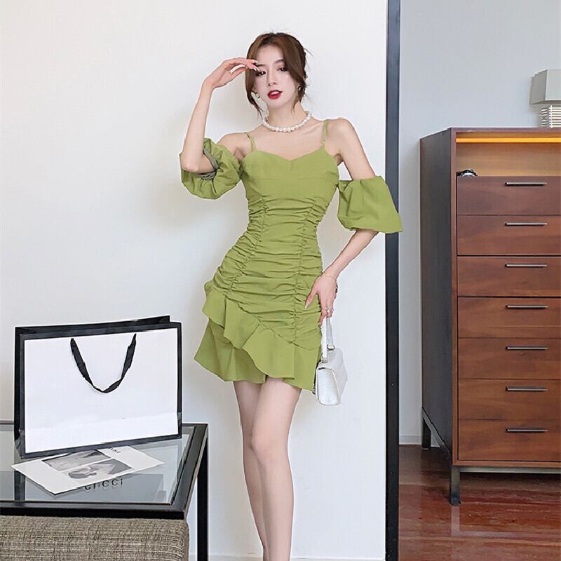 【CHERRYシリーズ】ワンピース ペプラム 緑 ボートネックデザイン 不規則 グリーン S M L XL