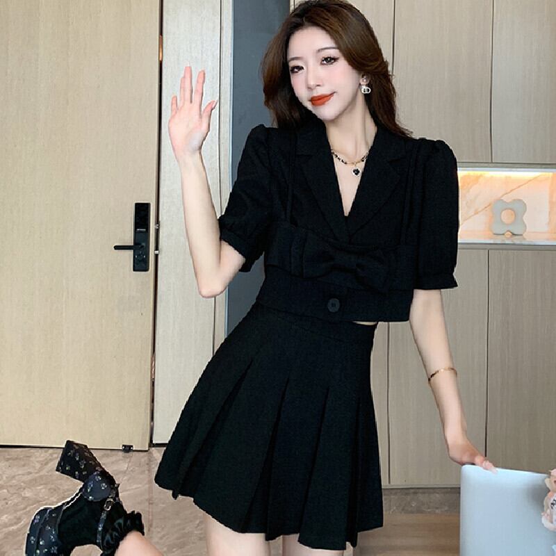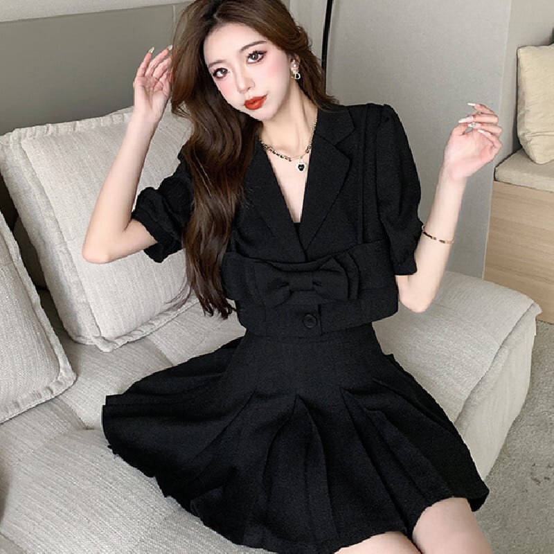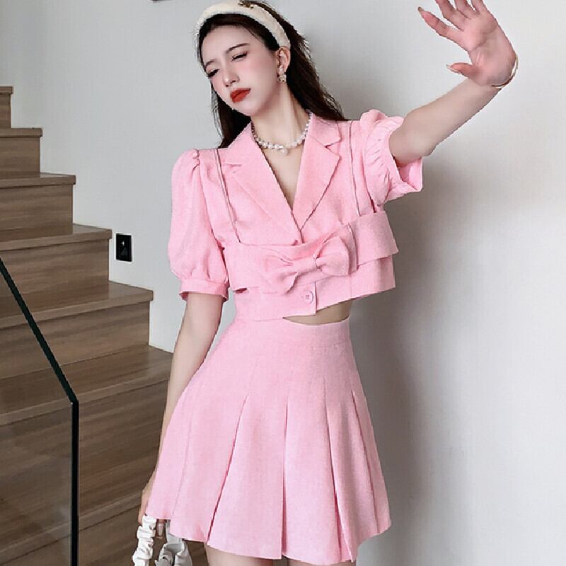 【CHERRYシリーズ】セットアップ トップス+スカート 2色展開 パフスリーブ スウィート ピンク ブラック S M L XL