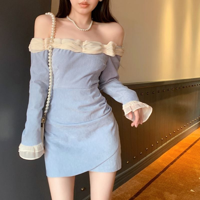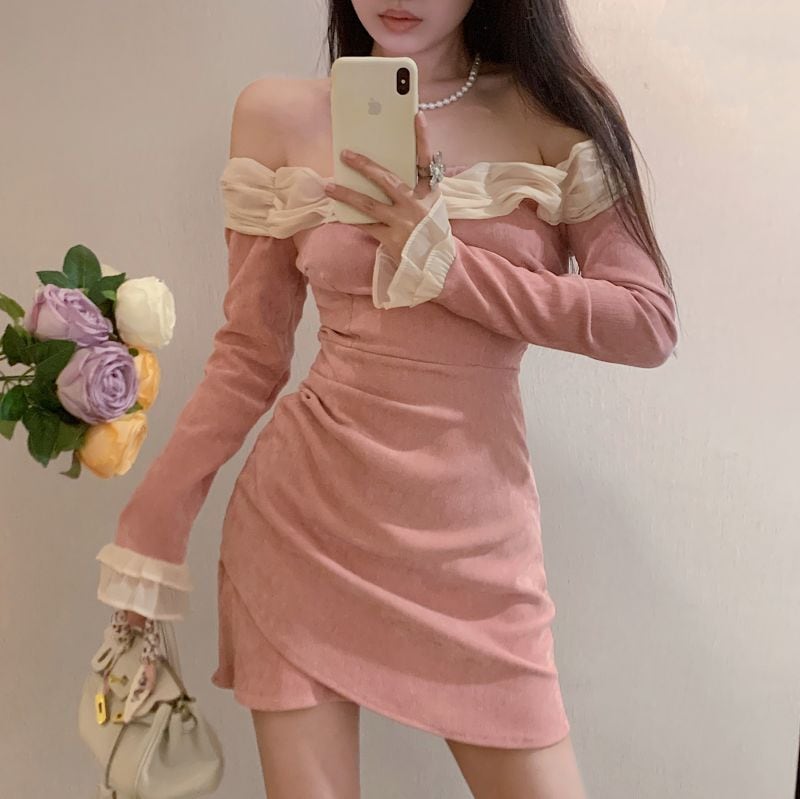 ワンピース スウィート セクシー ボートネック スピーカースリーブ ピンク ブルー S M L