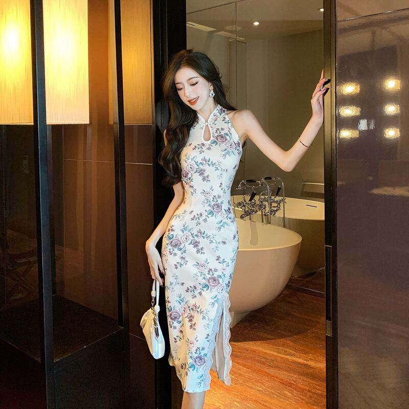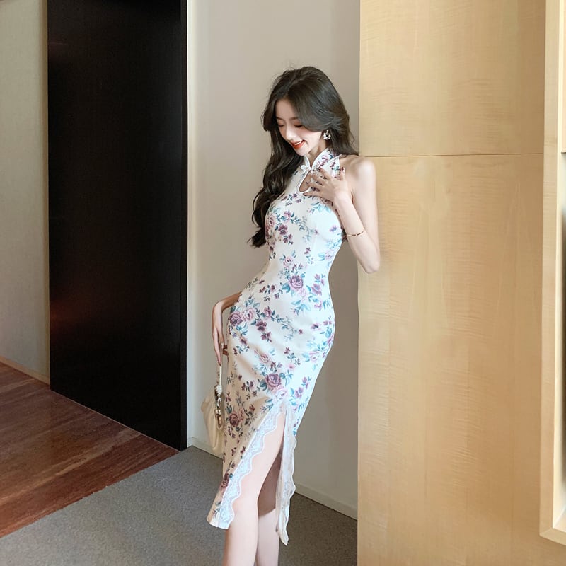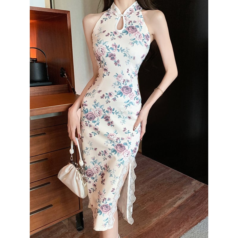 【CHERRYシリーズ】チャイナ風ワンピース レース 美人度アップ プリント 綺麗め S M L XL