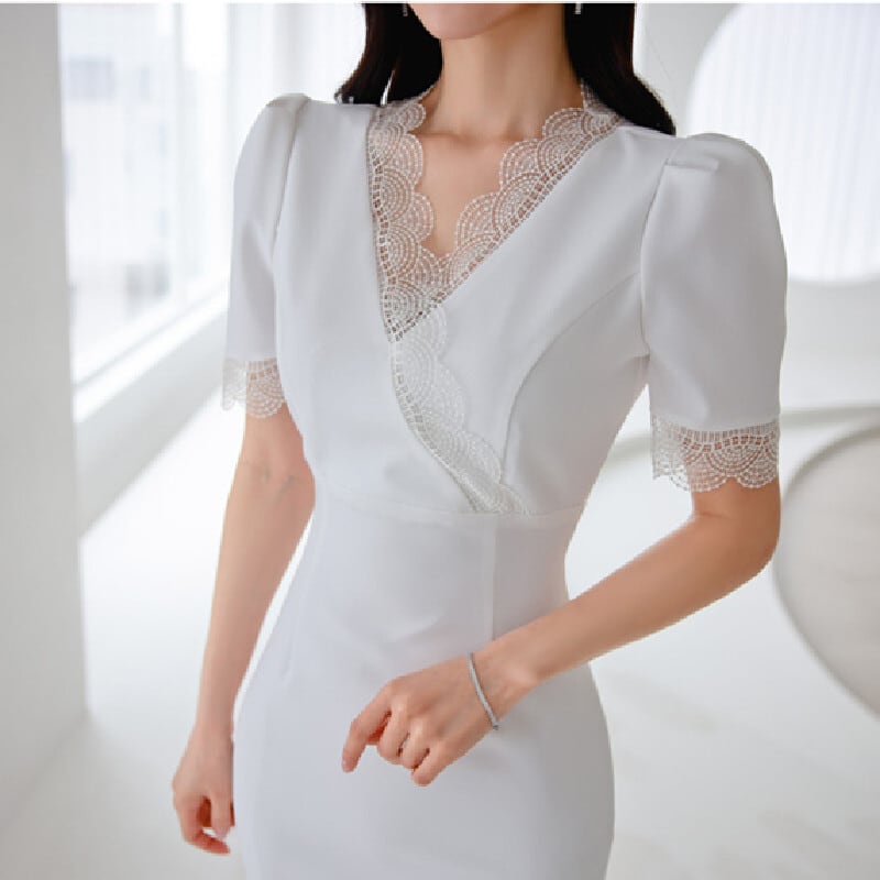 ワンピース Vネック エレガント 白 無地 バックスリット ホワイト S M L XL