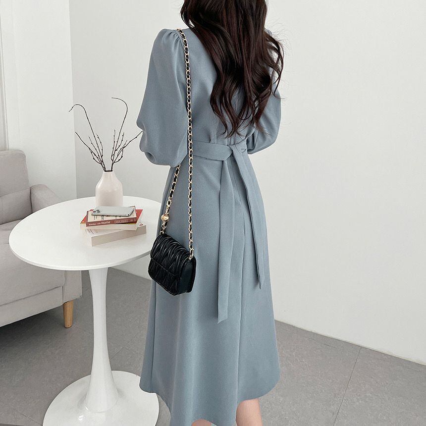 ワンピース 2色展開 Vネック エレガント OL/フォーマル ランタンスリーブ ブルー ブラック