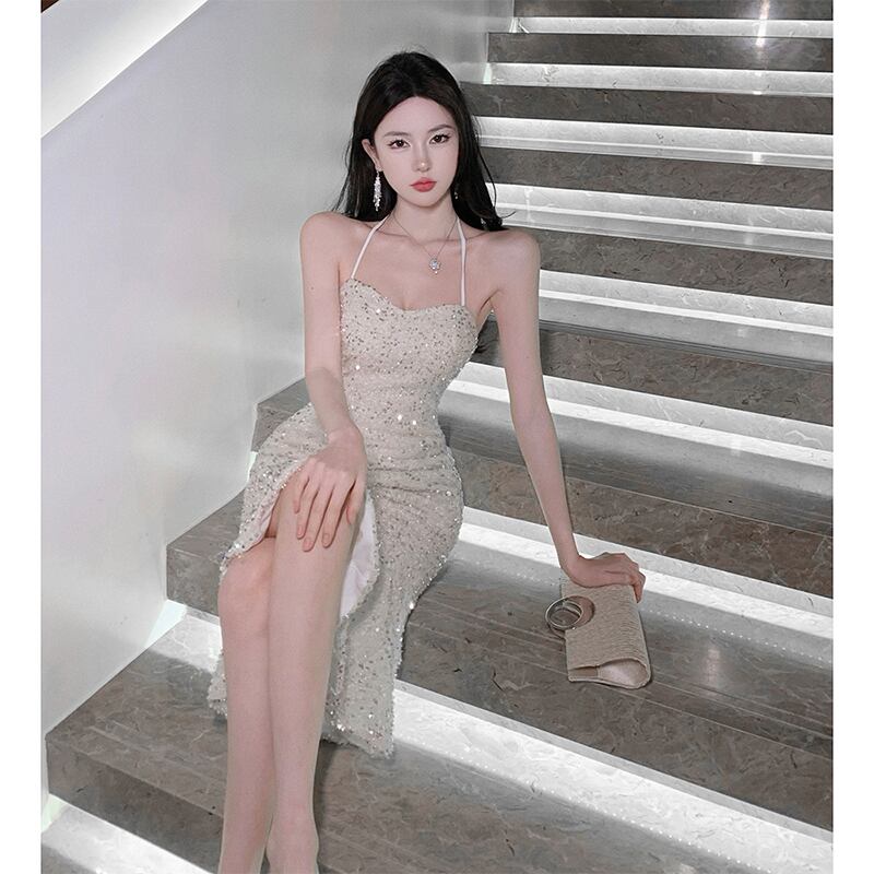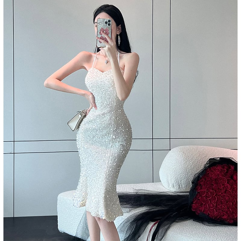 ワンピース セクシー 煌めかす 背見せ フィッシュテール スパンコール一 パーティー ホルターネック ホワイト S M L