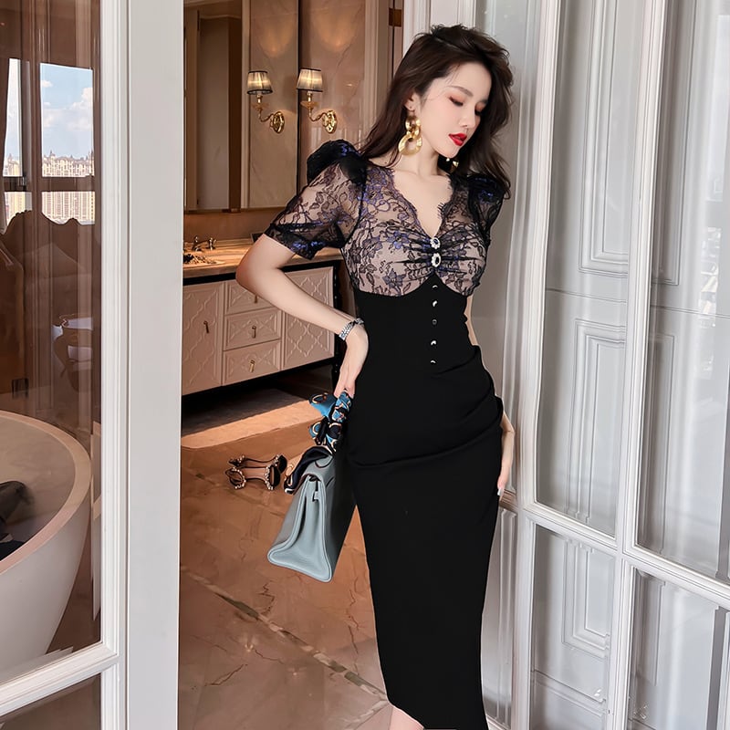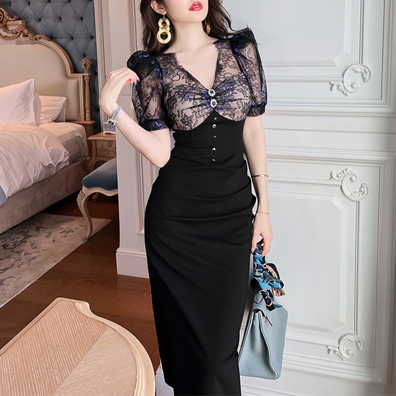 【夕暮薔薇シリーズ】ワンピース セクシー パーティー レース 切り替え Vネック ブラック S M L XL