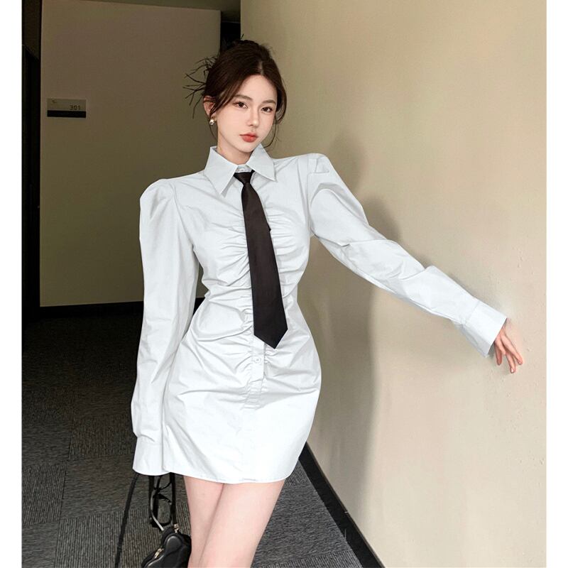 ワンピース 絶対流行 ネクタイ付き OL/通勤 シャツ Aライン ブラック ホワイト ブルー S M L
