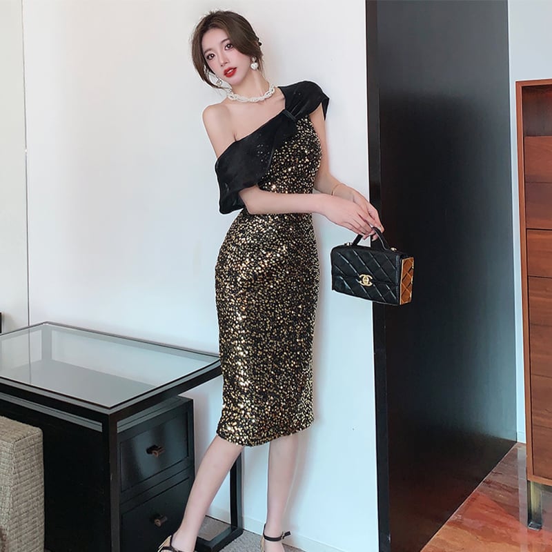ワンピース セクシー パーティー ワンショルダー スパンコール一 キラキラ ゴールド レッド S M L XL