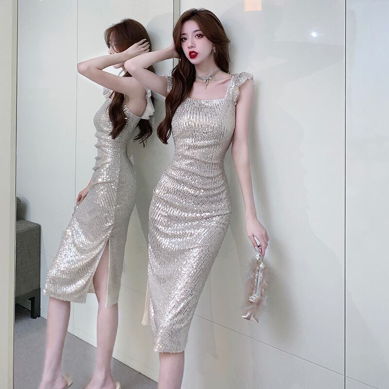 ワンピース セクシー パーティー スクエアネック スパンコール一 キラキラ シルバー S M L