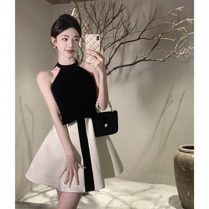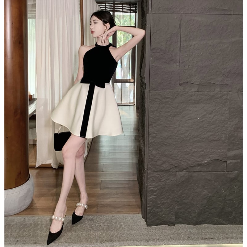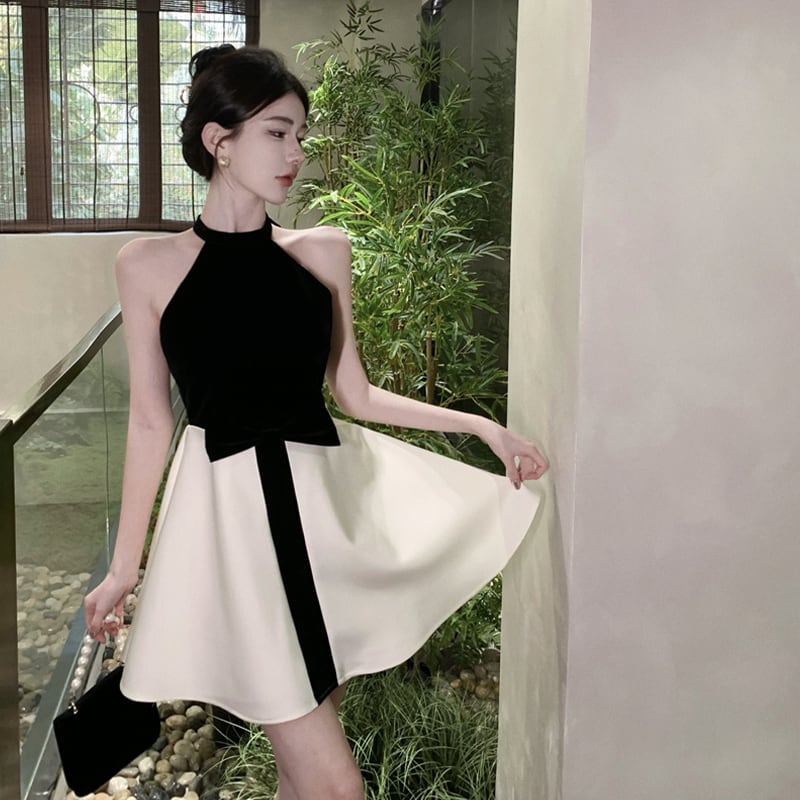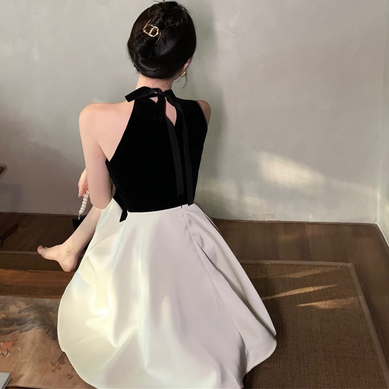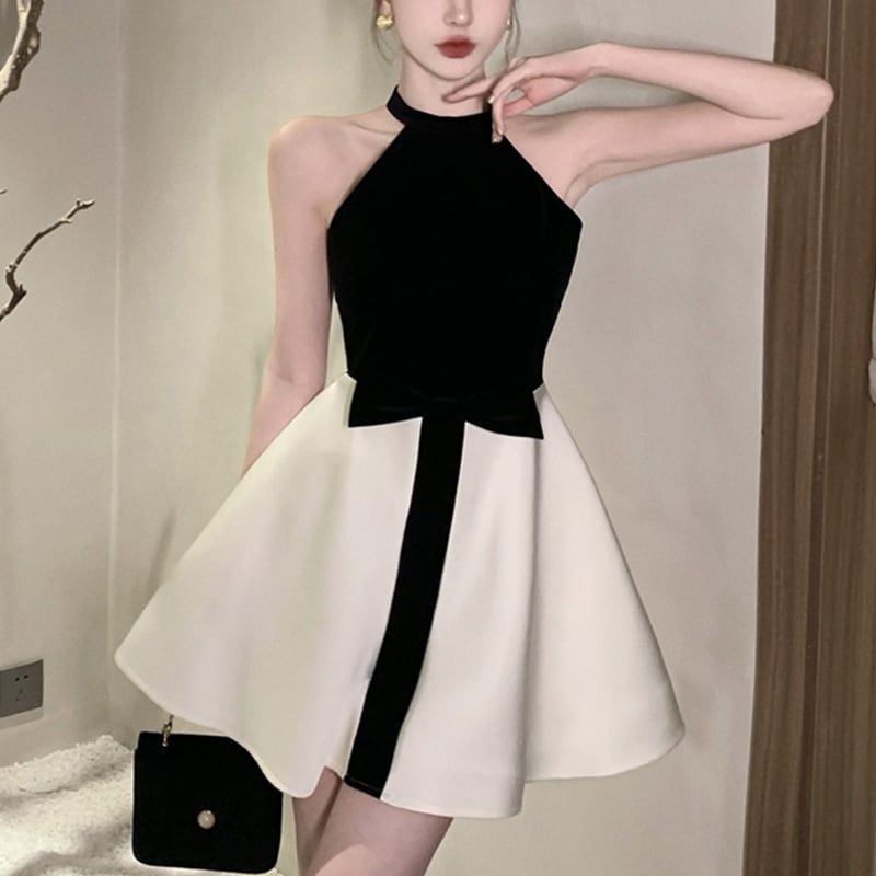 ワンピース セクシー Aライン アームホール 切り替え 蝶結び ブラック+ホワイト S M L