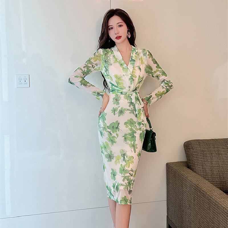 【香特儿シリーズ】ワンピース Vネック 花柄 エレガント 長袖 グリーン S M L XL