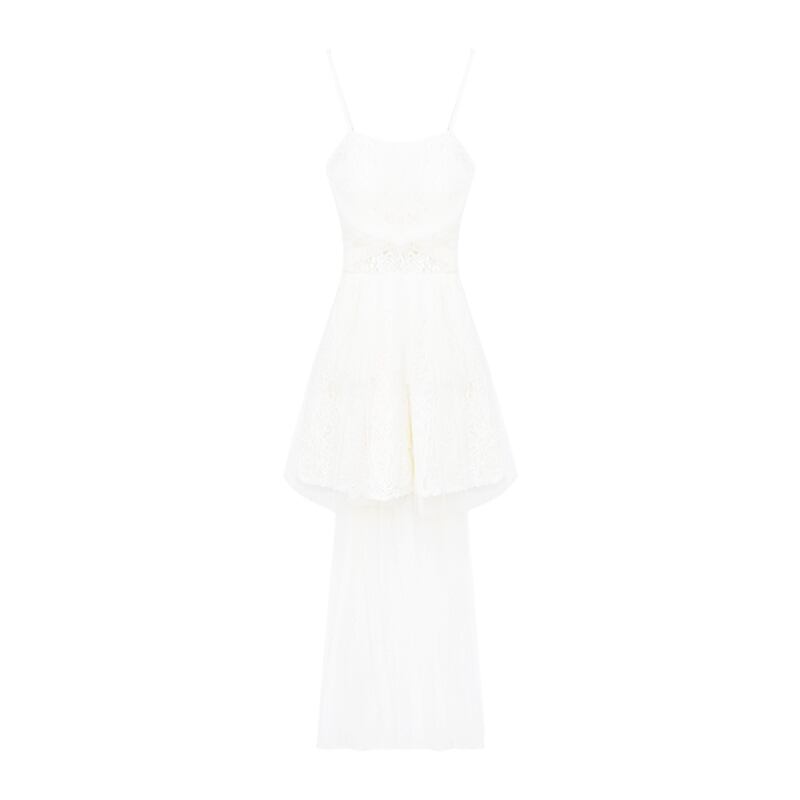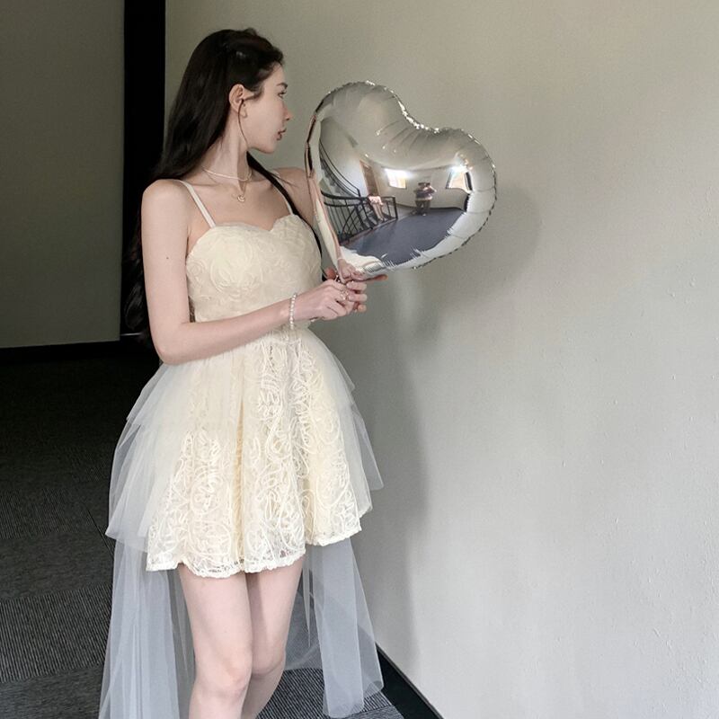 ワンピース セクシー レース Aライン チュール素材 切り替え 透かし彫り 吊りワンピース ベージュ S M L