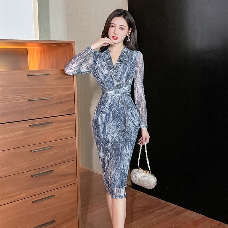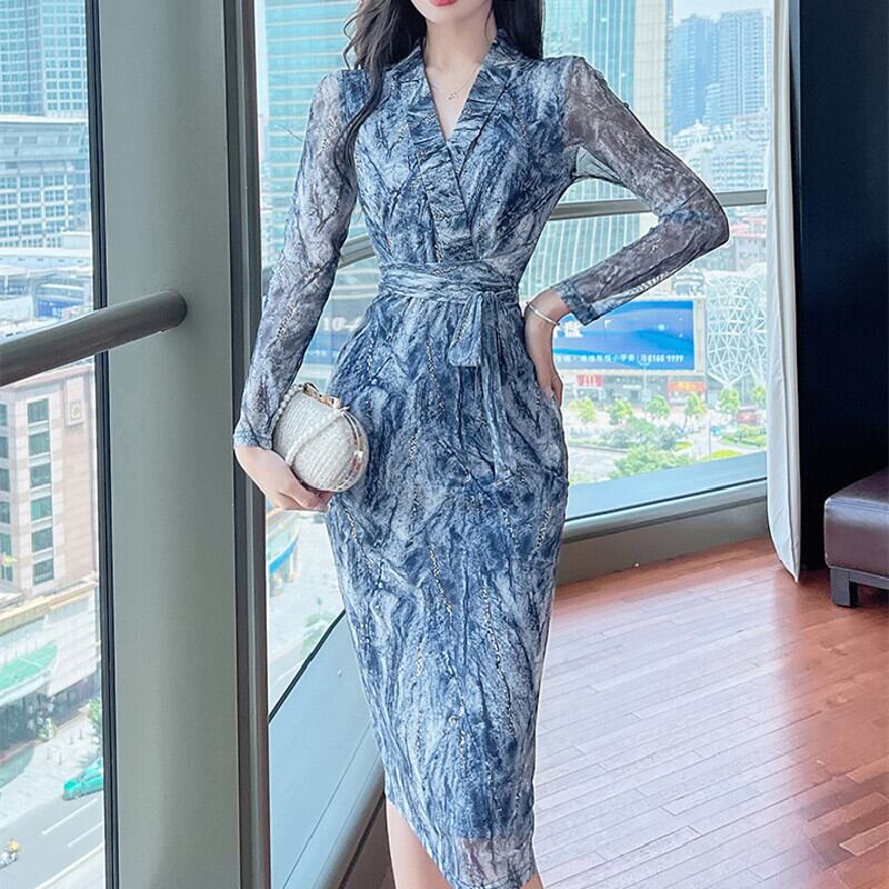【香特儿シリーズ】ワンピース Vネック 長袖 エレガント 気質アップ ブルー S M L XL