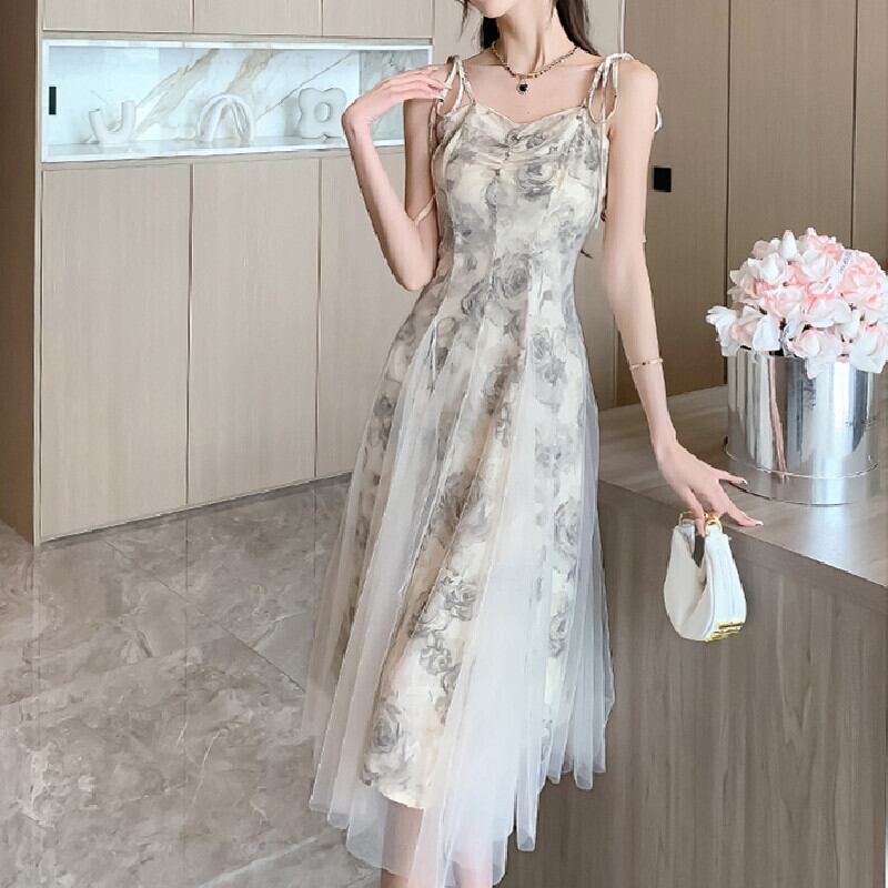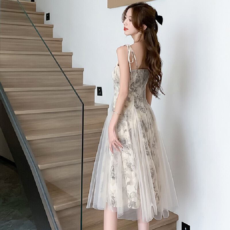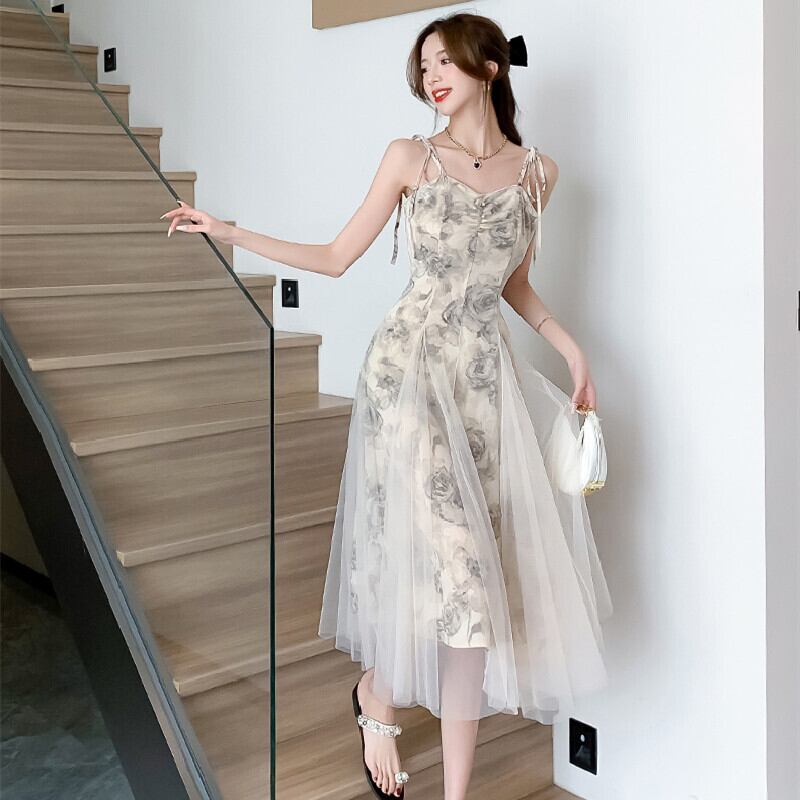 【CHERRYシリーズ】ワンピース プリント 吊りワンピース ベージュ S M L XL