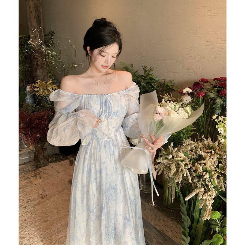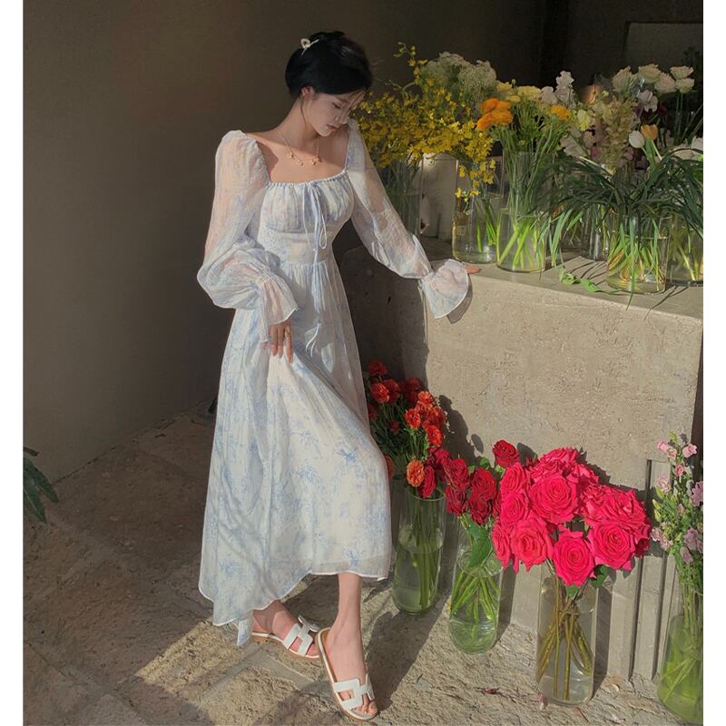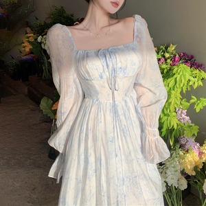 ワンピース 優雅 優しい 花柄 清新 文芸風 ロング丈 スクエアネック 大きいサイズ ホワイト+ブルー S M L XL 2XL 3XL