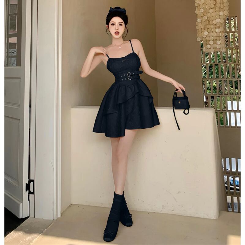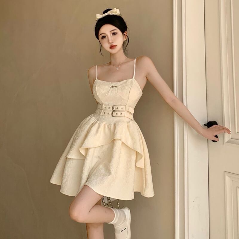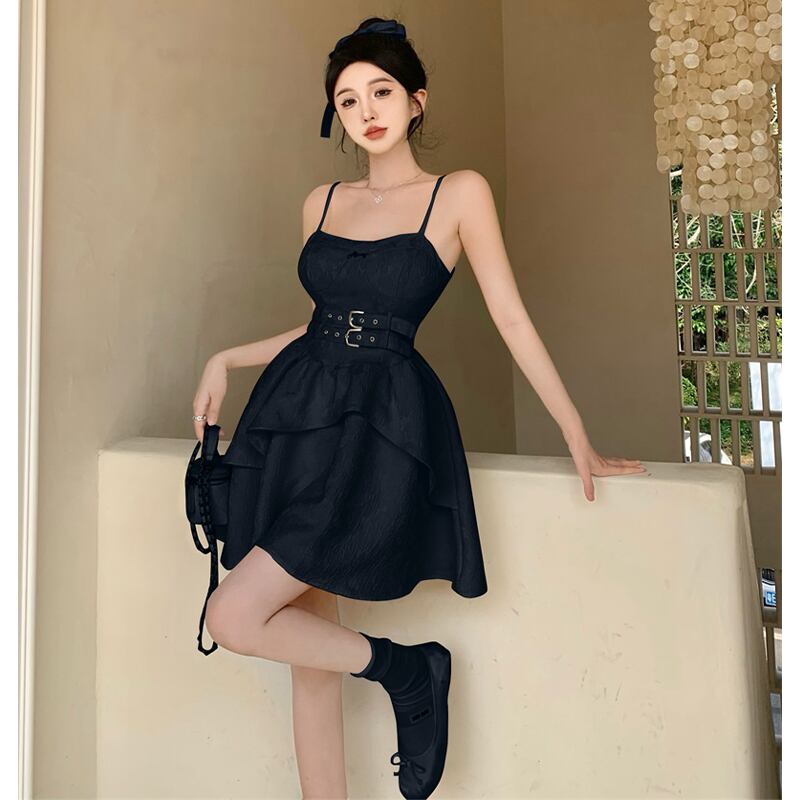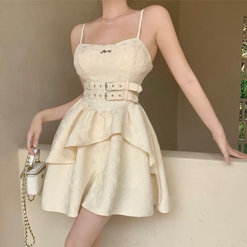 ワンピース セクシー ベルト付き デザイン感 かわいい Aライン 吊りワンピース ベージュ ブラック S M L
