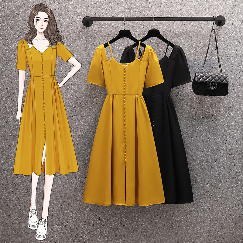 【YOYOシリーズ】ワンピース 2色展開 Aライン 無地 デザイン感 大きいサイズ イエロー ブラック M L XL 2XL