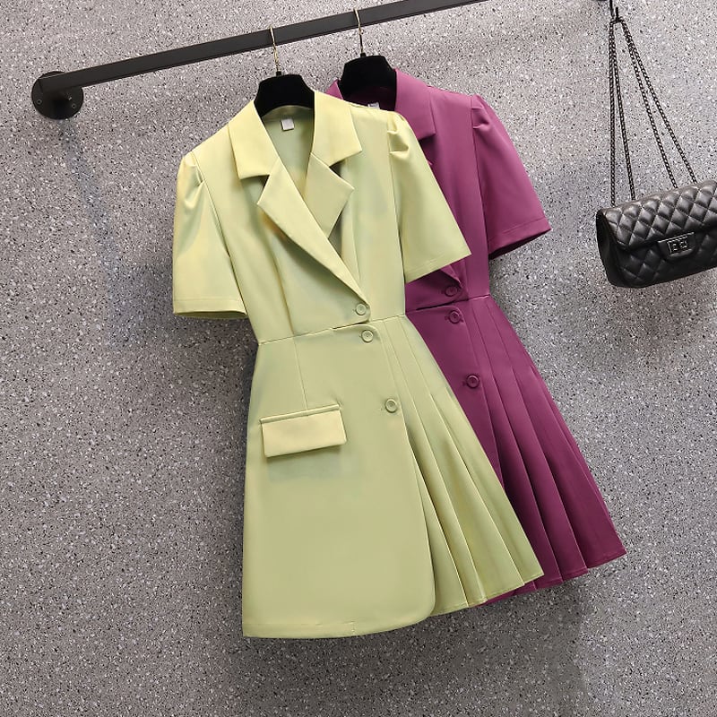 【YOYOシリーズ】ワンピース 2色展開 肩パフ Aライン スーツ 大きいサイズ グリーン パープル M L XL 2XL