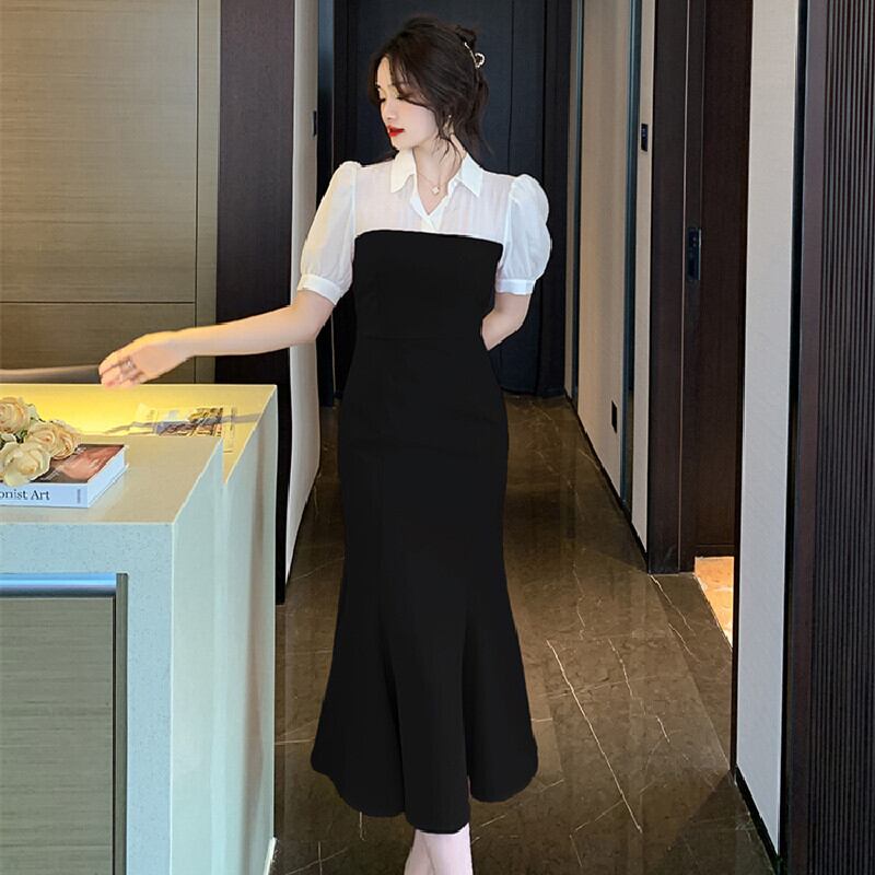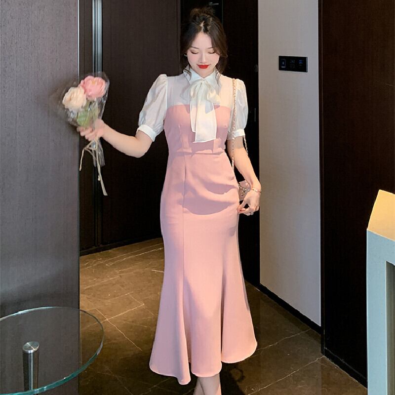 ワンピース 2色展開 パフスリーブ フィッシュテール ロング丈 ピンク ブラック S M L XL
