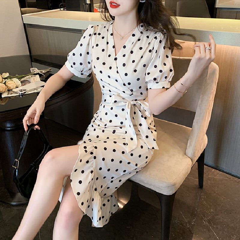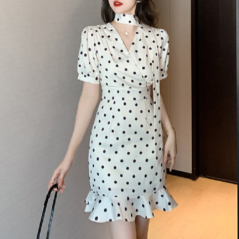 ワンピース ドット柄 長さ2パターン ペプラム ロング丈&ミニ丈 大きいサイズ 水玉模様 S M L XL 2XL