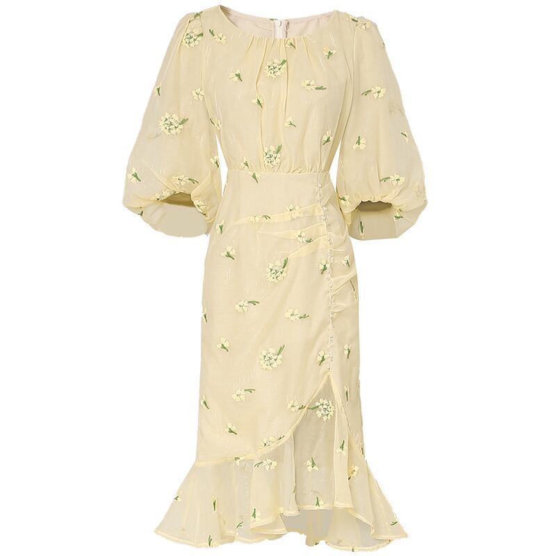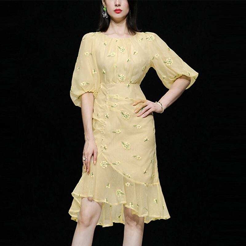 【ZiYanシリーズ】ワンピース 花柄 ラウンドネック パプラム ランタンスリーブ イエロー S M L XL