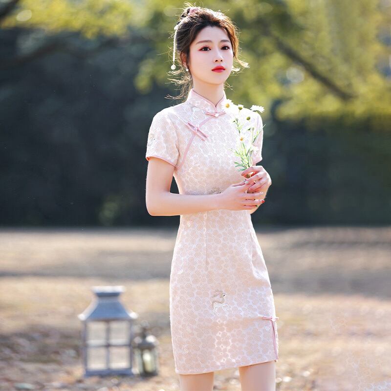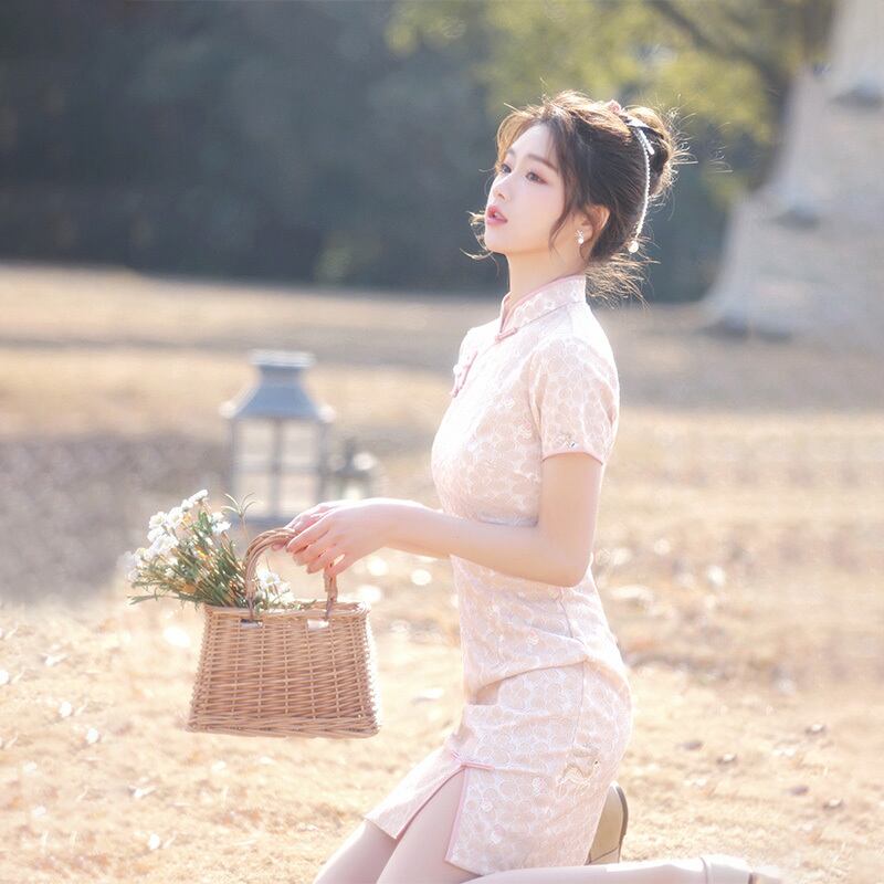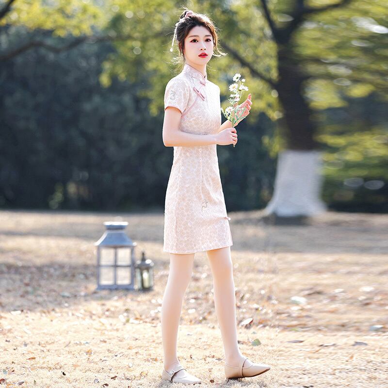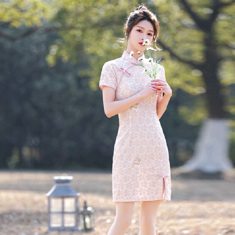 【花田シリーズ】チャイナ風ワンピース ミニ丈 レース 刺繡 スウィート ピンク S M L XL 2XL